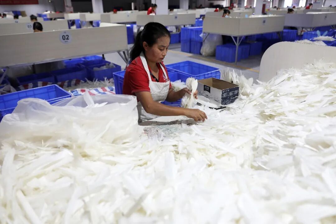 滕焕杰曾遇到过在鸭毛中掺入鸡毛和石灰粉、试图牟取更高利润的鸭毛中介。他清楚,对每批货都进行严格查验并不现实。为此,他想出了“打绒计价”的办法:先从毛中介那里收来原料,经自家工厂分拣、加工制成羽绒后,再按实际克重与中介结算。这样一来,那些试图掺杂造假的毛中介因心虚而主动退出交易,留下的便多是品质可靠的供应商。