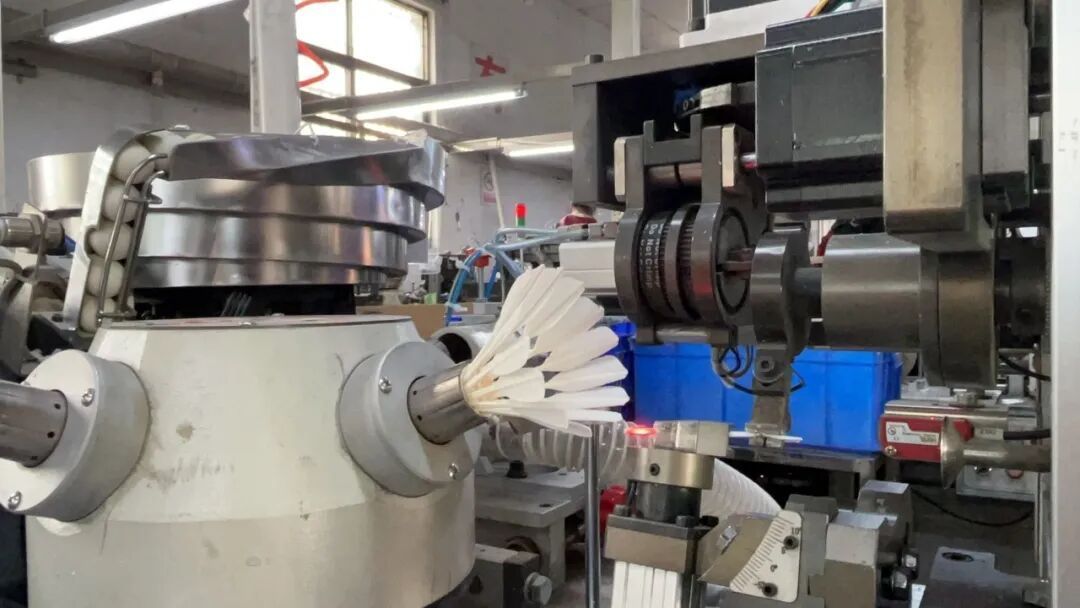 ▲2026年1月12日,叶光兴的羽毛球制造厂内,自动化加工设备将毛片插入球头,单只羽毛球需要插入16根毛片 图/受访者提供