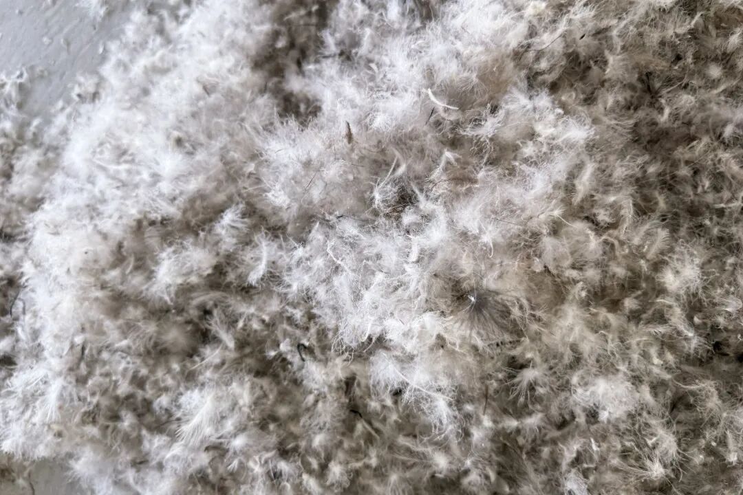 ▲经过机器提纯制成的原料绒,绒朵含量高,变得蓬松。滕焕杰收来的鸭毛出绒率在12%到19%之间,100斤鸭毛可以制成12至19斤原料绒 图/受访者提供