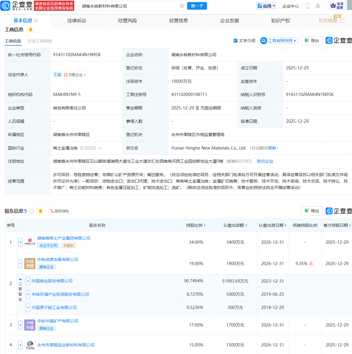 近日,湖南永核新材料有限公司成立,法定代表人为王超,注册资本为1亿元郑州配资网,经营范围包含:危险废物经营;非煤矿山矿产资源开采;稀有稀土金属冶炼;金属矿石销售;稀土功能材料销售等。企查查股权穿透显示,该公司由湖南省稀土产业集团有限公司、中国铀业(001280)旗下中核资源发展有限公司等共同持股。