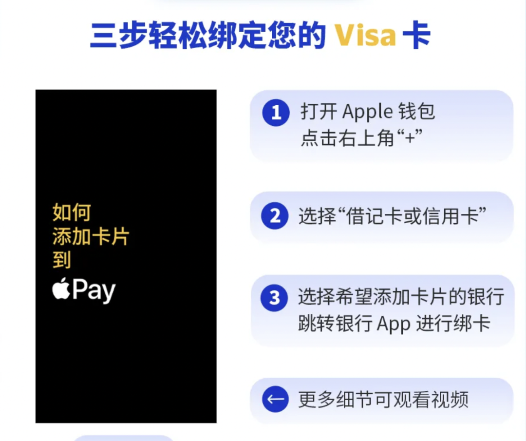 据介绍,设置Apple Pay很简单。打开Apple钱包App,轻点加号,然后按照提示步骤操作跳转至银行App选择添加Visa卡即可,或直接通过银行App将Visa卡添加到Apple钱包。